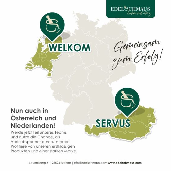 Wir öffnen die Türen und unsere Herzen für die ersten beiden europäischen Länder! Ab sofort kannst Du als Vertriebspartner/in in den Niederlanden und in Österreich unsere köstlichen Edelschmaus-Produkte verkaufen. Unterstützung bekommst Du durch unsere erfolgreichen Teams und einem komplett aufgestelltem Business.